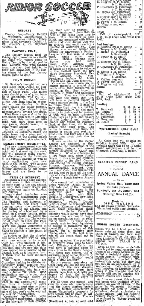 Originally calling the-then Polebarry Park our home, Crusaders AFC competed mainly in schoolboys football for the first few years of our existence, reaching the Paddy Cooke Memorial Final in our first season. The article below from the Munster Express dated 7th August 1953 mentions the Crusaders’ affiliation application, and also notes many of the initial committee members, including Mr. Tom Horan (Chairman), Mr. Sean King (Secretary), Rev. Tom Ahearne C.C (Hon. President) and Mr. Louis Dolan and Mr. John Kearney (Vice Presidents).
