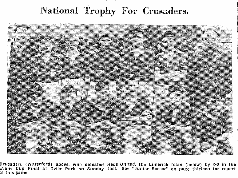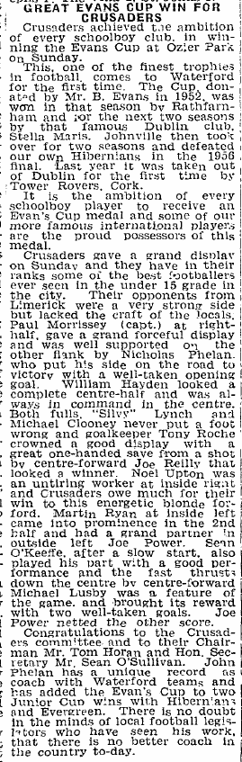 In February 1960, the club achieved the great honour of winning the Evans Cup trophy, the national schoolboys cup. Players on that team included the great Paul Morrissey, Nicky Phelan, Silvy Lynch and Tony Roche. The article below from the Munster Express, dated 12th February 1960 captures exactly the importance of such a victory, Crusaders being the first to bring the Evans Cup to Waterford.