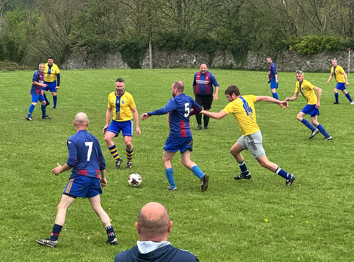 On a near-perfect surface, diagonally striped by Francie earlier in the day and manicured over the weekend by Willie Power and his team of landscape experts (sponsored by Geoff’s – “the alternative venue”), our 4th division entertained a strong Kilmacow side yesterday evening. With Paul Lawrence still making his way back from Bilbao (and still living in the Fergie-era), and Peter, Norman and Duckie unavailable, the elders still managed to give a good account of themselves on the night. A case of one side took their chances, and the other didn’t it seems, we finally got on the scoresheet after 55′ thanks to Patrick Egan, but after several chances had gone abegging earlier in the game, this was a case of “what might have been”. Thanks to Kilmacow for a good game, and we hope you found your way home from Butlerstown safely. ☺️