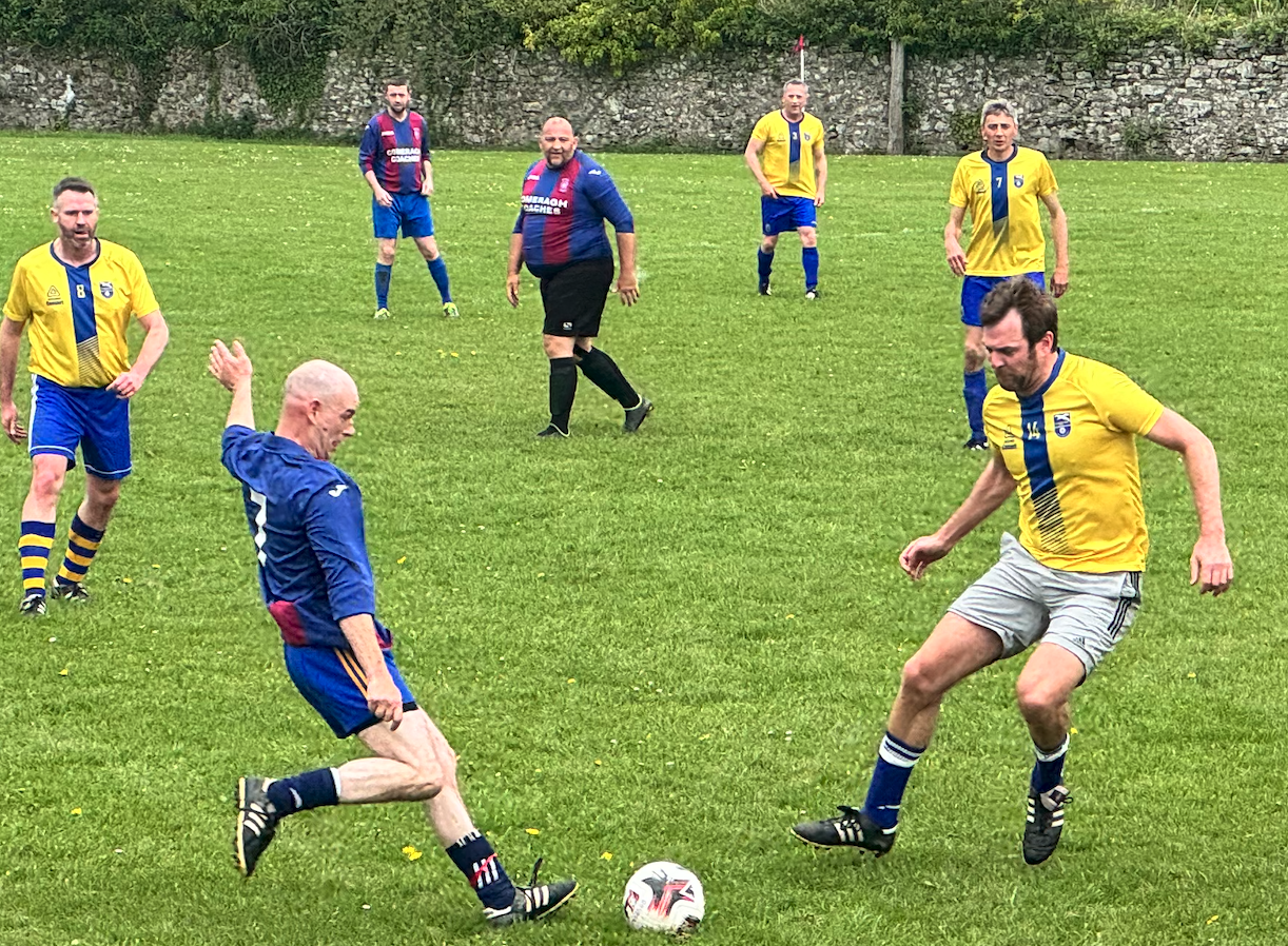 At the back, Paul O’Neill and Peter O’Byrne were immense, shutting out the Dunmore attack completely from the 6th minute onwards. Kent lent much to the attacking efforts and PK rolled back the years, to a simpler time of landlines, Opel Cadets and the Irish punt, marauding forward up the right flank. In the immediate aftermath, Johno was overheard proclaiming that PK would be the first name on his team sheet next time around!