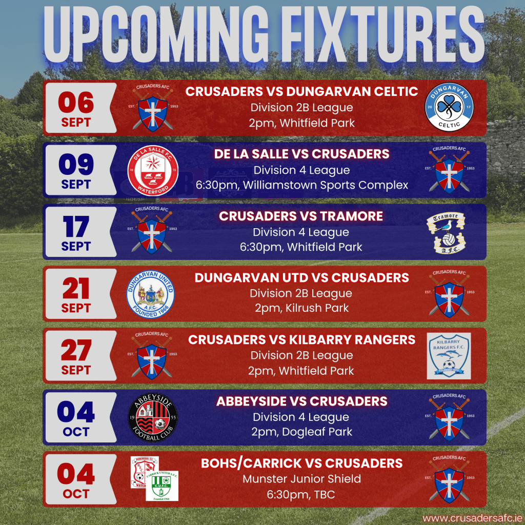 The W&DJL have released fixtures for the next 4 weeks, and it’s going to be a busy period at Whitfield Park with home games on the 6th, 17th and 27th of September. Our travels will take us to Williamstown, Dungarvan and Abbeyside. Finally, on 4th OCtober, we’ll make our bow in this season’s Munster Junior Shield away to the winners of an earlier fixture between Bohs and Carrick.