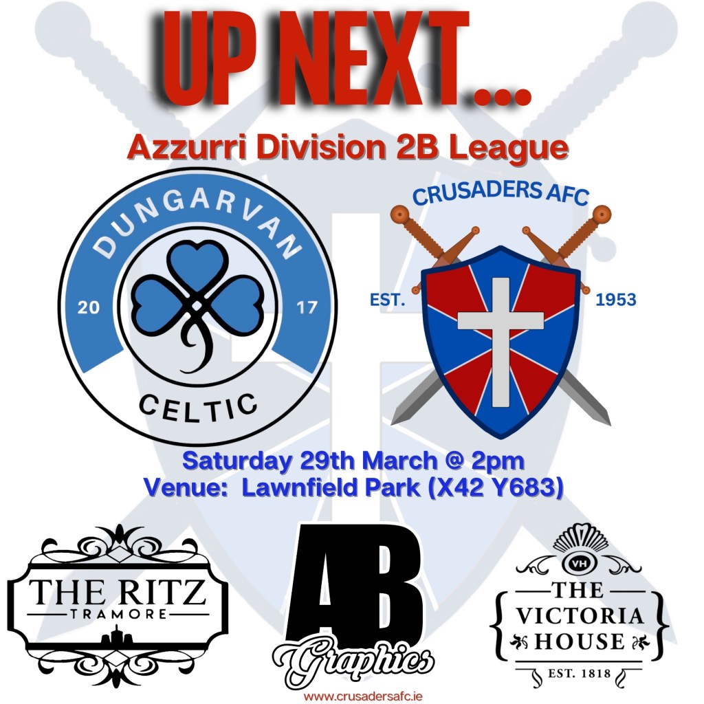 Our 2B team travel to Dungarvan this Saturday to take on early table-toppers Dungarvan Celtic. Kick off is at 2pm.