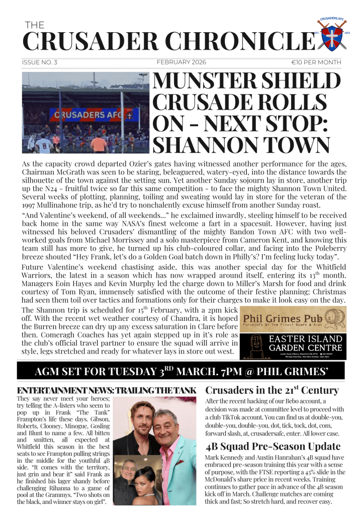 Our 2B team travel to Clare to take on Shannon Town Utd in the Munster Junior Challenge Shield. Frank The Tank and his 4th division friends have been busy in the studio to get us in the mood…❤️💙⚔️